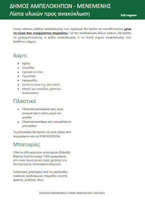 Παράλληλα, στο σχολείο μας , θα συνεχίσουμε να κάνουμε ανακύκλωση, συλλέγοντας τα παρακάτω υλικά: